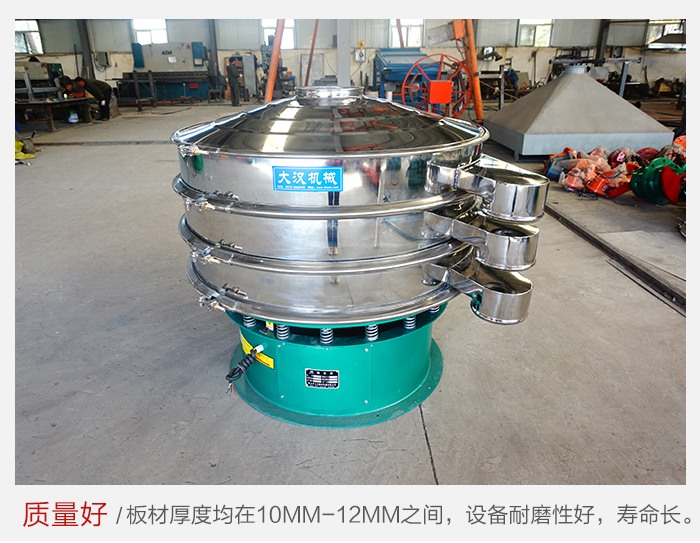 大漢廠家生產(chǎn)的雙層旋振篩采用優(yōu)質碳鋼或不銹鋼材質,板材厚度均在10mm-12mm之間,設備耐磨性好,使用過程中不會因設備質量問題而造成設備停機問題,可以在很大程度上降低設備的維護費用。