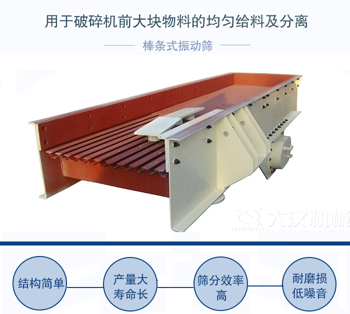 BTS棒條式振動篩用于破碎機前大塊物料的均勻給料及分離,棒條式振動篩特別適用于水電行業、建筑石料及黑色或有色金屬、礦石粗破前給料和初篩;棒條式振動篩振動給料機采用振動電機為激振源,結構簡單、維護方便;產量大,壽命長,結實耐用。