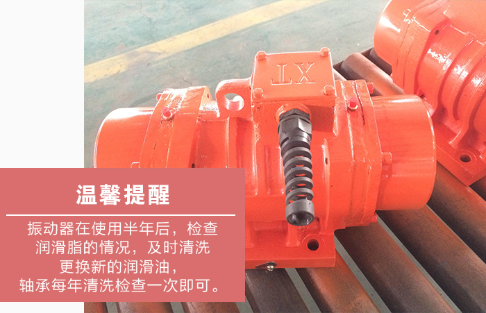 4、大漢機械溫馨提醒:振動器在使用半年后,檢查潤滑脂的情況,如發現變干或者有硬塊時,及時清洗更換新的潤滑油,軸承每年清洗檢查一次即可。
