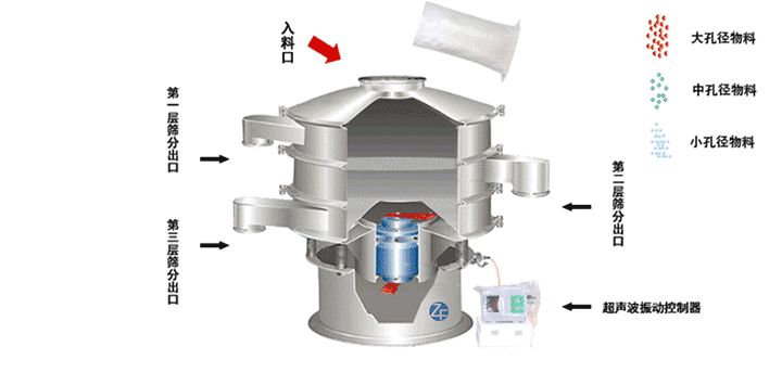 超聲波振蕩篩采用超聲波換能器清網裝置,改變了單一頻率,解決強吸附性,易團聚,高靜電,高精細,高密度,輕比重等篩分難題,篩分精度可提高1-99%,產量可提高1-10倍,滿足了500目以上工業化生產需要。
